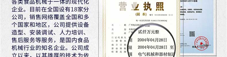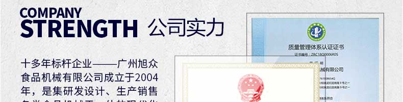 廣州旭眾食品機械有限公司是一家集科研開發(fā),生產(chǎn)設(shè)計,營銷服務(wù)為一體的現(xiàn)代化生產(chǎn)企業(yè)?,F(xiàn)代化生產(chǎn)車間,精湛制造技術(shù),所產(chǎn)機械歷經(jīng)市場重重考驗,不斷贏得海內(nèi)外客戶的贊譽。