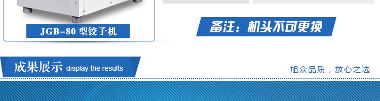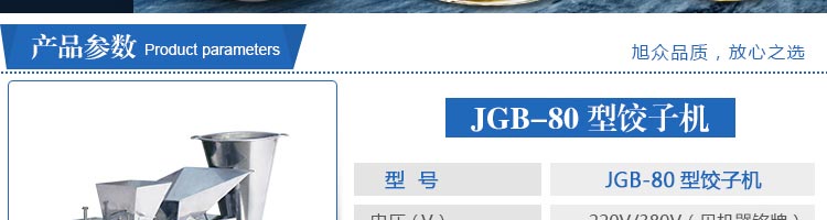 JGB-80型號(hào)餃子機(jī),本機(jī)是一款可生產(chǎn)各種肉餡、肉菜混合餡、全菜餡及其他種餡餃子的設(shè)備。包制出來的餃子可蒸、煮、炸、煎等多種調(diào)理。適用于賓館、飯店、餐廳、團(tuán)體食堂加工,幼兒園、速凍餃子生產(chǎn)。