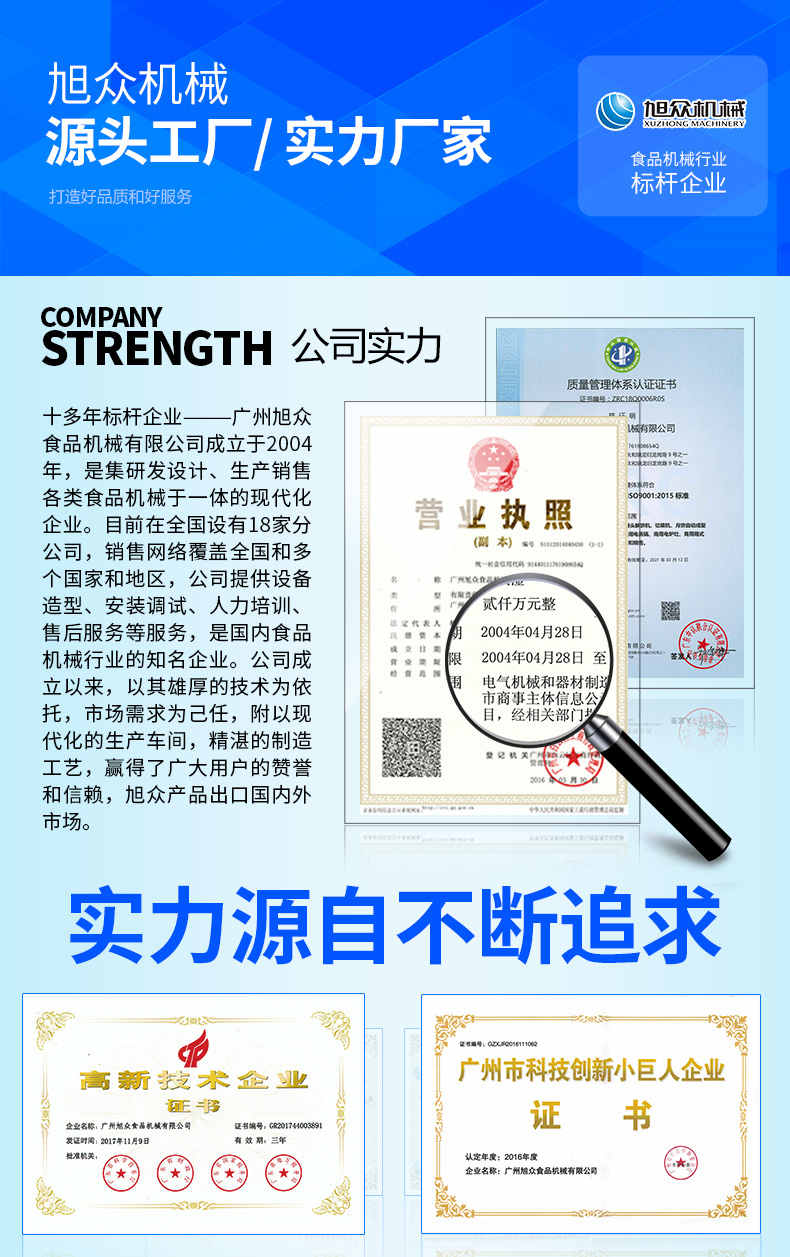 廣州旭眾食品機(jī)械有限公司是一家集科研開發(fā),生產(chǎn)設(shè)計(jì),營銷服務(wù)為一體的現(xiàn)代化生產(chǎn)企業(yè)?,F(xiàn)代化生產(chǎn)車間,精湛制造技術(shù),所產(chǎn)機(jī)械歷經(jīng)市場重重考驗(yàn),不斷贏得海內(nèi)外客戶的贊譽(yù)。
