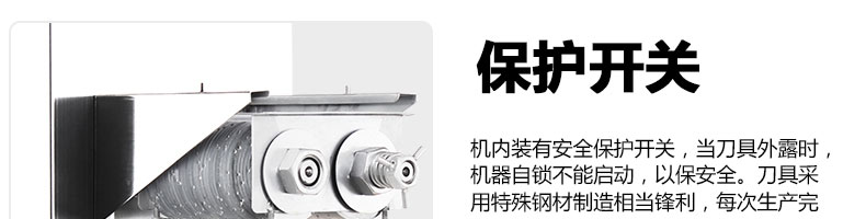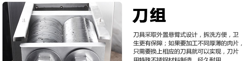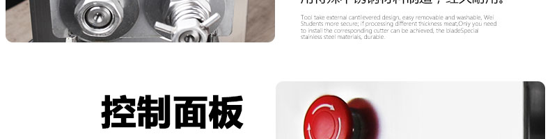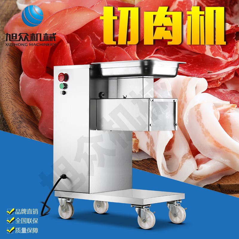 XZ-QE切肉機(jī),是一款可方便移動(dòng)的肉類加工設(shè)備,配置單層刀具一次性切肉片,二次切肉絲,再切成粒。底座設(shè)置有滑輪,移動(dòng)靈活,輕松便捷;刀具采取外置懸臂式設(shè)計(jì),拆洗方便,衛(wèi)生更有保障;配置多種刀具,可加工不同厚度的肉片,實(shí)現(xiàn)一機(jī)多用;機(jī)內(nèi)裝有安全保護(hù)開頭,刀具外露時(shí),機(jī)器自鎖不能啟動(dòng),以保安全;刀片用特殊不銹鋼材料制造,經(jīng)久耐用;卸下的刀具,不用清洗直接放置在6攝氏度以下的冰箱里,刀具余肉不發(fā)臭。