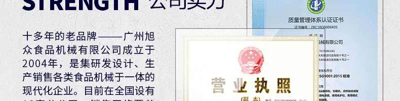 廣州旭眾食品機(jī)械有限公司是一家集科研開發(fā),生產(chǎn)設(shè)計,營銷服務(wù)為一體的現(xiàn)代化生產(chǎn)企業(yè)?,F(xiàn)代化生產(chǎn)車間,精湛制造技術(shù),所產(chǎn)機(jī)械歷經(jīng)市場重重考驗,不斷贏得海內(nèi)外客戶的贊譽(yù)。